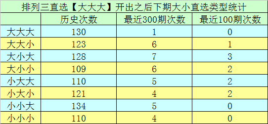 2.在前9次直选【大大大】组合之后,下期开奖号码分别为:086-061-848-730-724-852-179-537-938,组三包含1期,组六包含8期。本期奖号排除对子,看好开出组六。